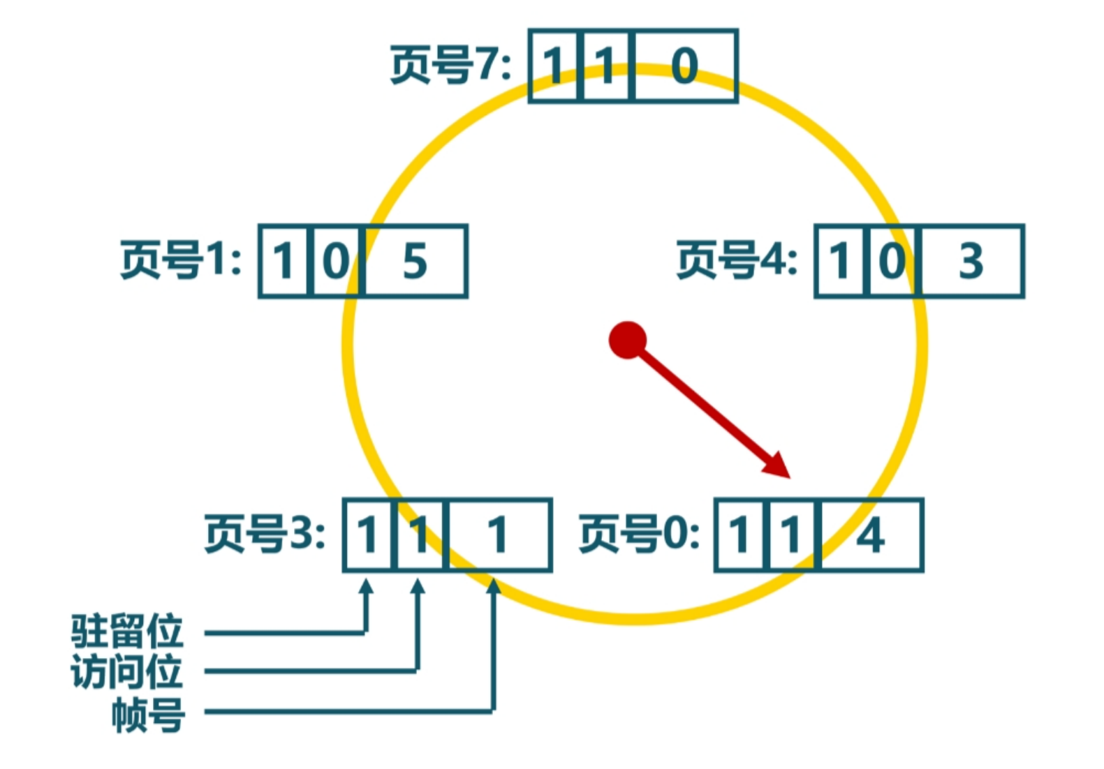 这种近似LRU策略类似时钟旋转的过程,所以也称为Clock(时钟,也称 Second-Chance 二次机会 )置换策略。虽然Clock置换策略不如LRU置换策略的效果好,但它比不考虑历史访问的方法要好,且在一般情况下,与LRU策略的结果对比相差不大。