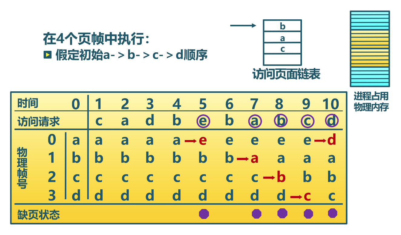 FIFO置换策略虽然在实现上简单,但它对页访问的局部性感知不够,及时某页被多次访问,也可能由于它较早进入内存而被置换出去。