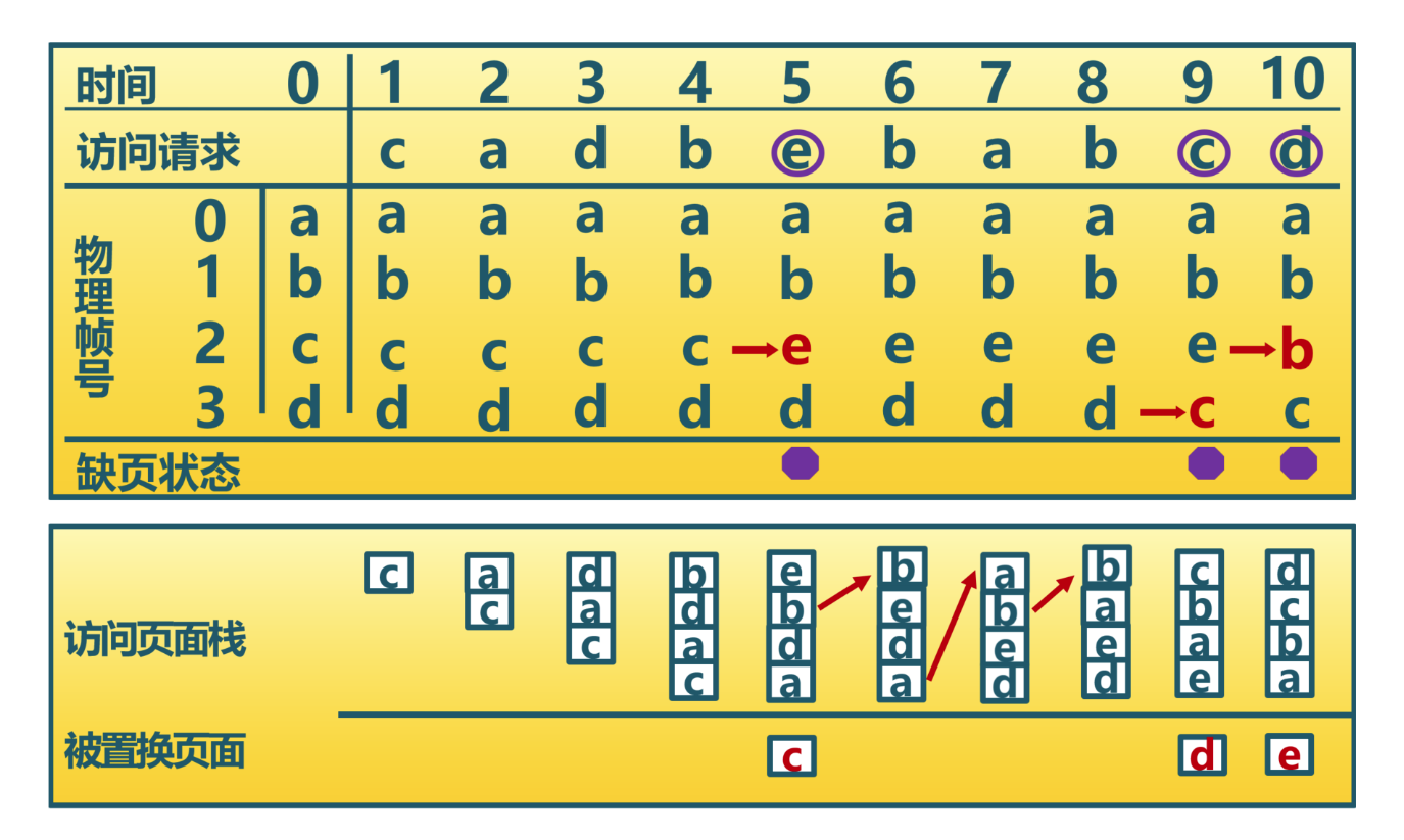 这个方法消耗更多内存,且执行开销很大。由于链表的容量,使得它只能放在内存中。如果由处理器硬件来处理,则对硬件资源要求很高,对于每次访问页,处理器都需要查找链表,并更新链表。如果由软件来处理,那操作系统需要感知每次的访问页情况,则需要处理器通过某种异常机制来通知,并在随后的异常处理过程中,完成对链表的查找和更新工作。这两种方法的执行时间开销都很大,所以stack方法也停留在理论的可行性上了。