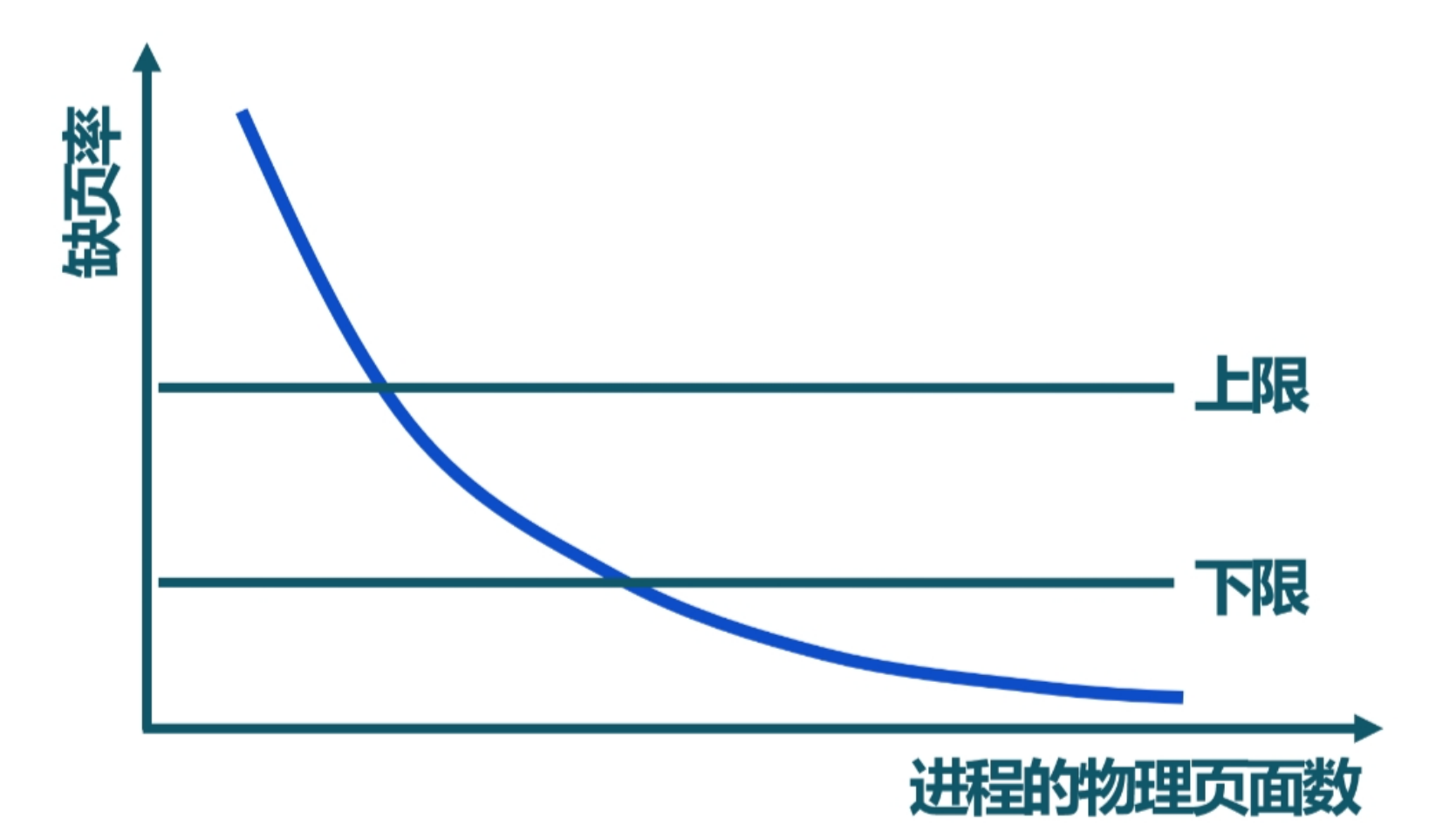 在上面的各种置换策略中,或多或少涉及到对页面访问时间的记录和查找,排序等操作,开销很大。而置换策略的目标是减少缺页次数或缺页率。缺页率置换策略就是一种直接根据缺页率的变化来动态调整任务的物理内存大小的方法。如果缺页率高了,就增加任务占用的物理内存,如果缺页率低了,就减少任务占用的物理内存。任务占用的物理内存也称常驻集,即当前时刻,任务实际驻留在内存中的页面集合。
