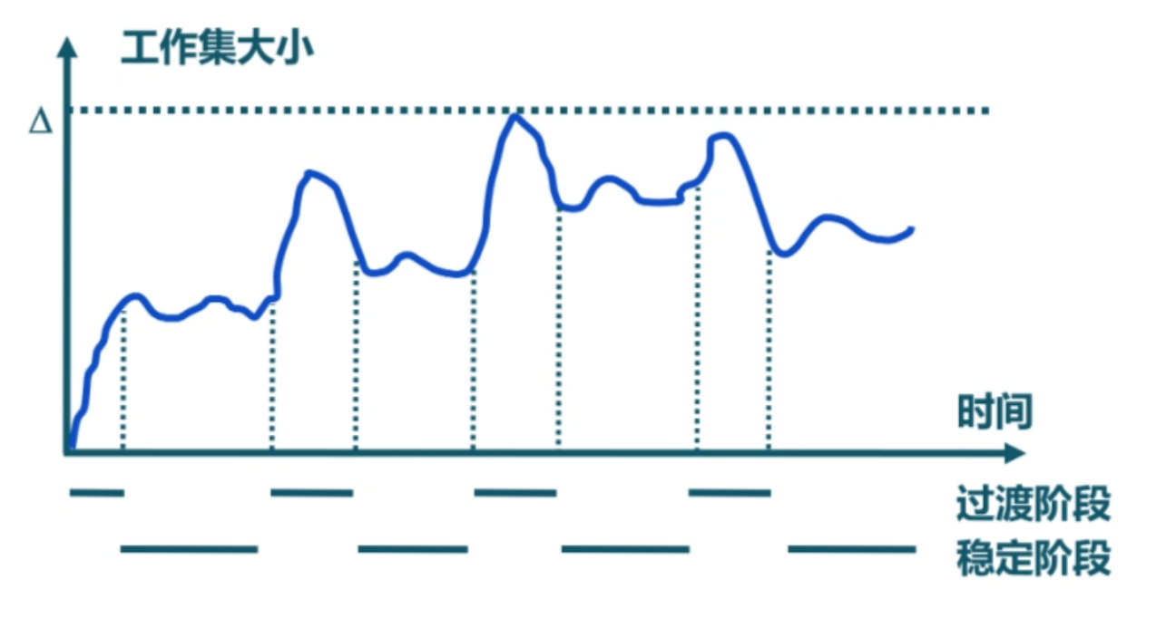 注意,上述工作集的概念和对缺页中断的推断,其实是建立在程序执行具有局部性这个基础上的,也是一种根据历史来推测未来的启发式方法。为了基于工作集的特征来设计置策略,我们需要量化工作集的概念。在t时刻,任务最近n次内存访问均发生在m个页面集合上,那么这个页面集合就是任务在t时刻最近k次内存访问下的工作集,用 w(k,t) 来表示。工作集中页面数量用 |w(k,t)| 表示。 随着任务的执行,工作集中的页面会发生变化,其数量也会发生变化。如果一个任务占用的页面数与其工作集大小相等或超过工作集,则该任务可在一段时间内不会发生缺页异常。如果其在内存的页面数小于工作集,则发生缺页中断的频率将增加。