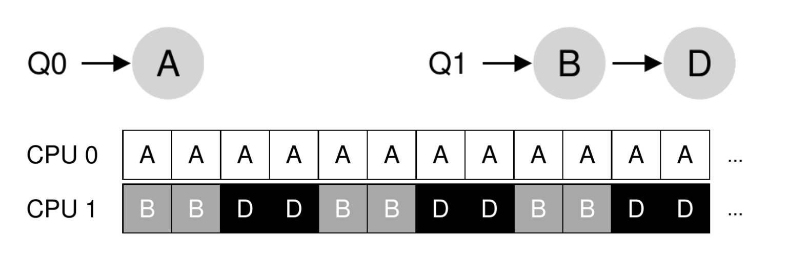 采用单队列调度的一个好处是,它支持自动负载平衡,因为决不会出现一个CPU空闲而其他CPU过载的情况。