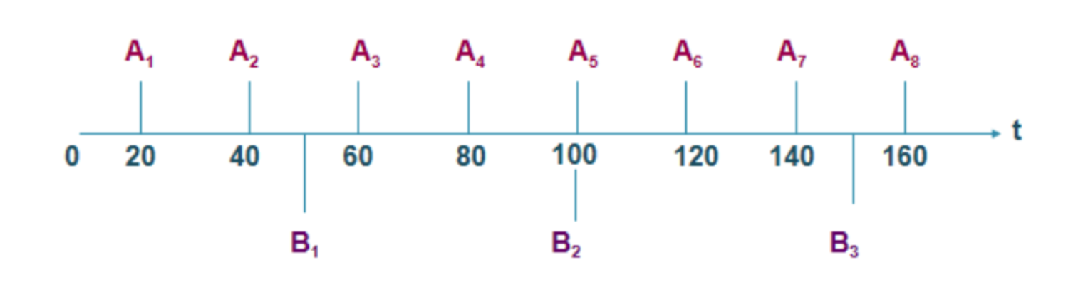• t=60:然后在60ms时(PA的第四个周期开始),PA抢占PB并再次执行,直到65ms时结束;