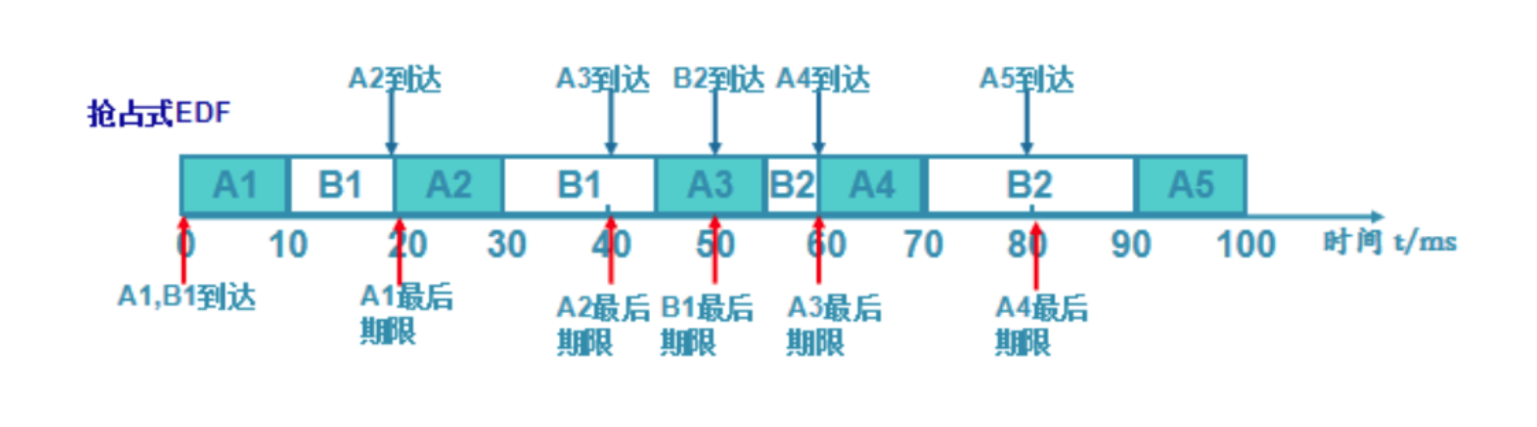 另一个典型的实时调度算法是最早截止时间优先(Earliest Deadline First,EDF)算法,其基本思想是根据进程的截止时间来确定任务的优先级。截止时间越早,其优先级就越高。如果进程的截止期相同,则处理时间短的进程优先级高。操作系统在调度过程中,选择优先级最高的就绪进程执行,高优先级的进程会抢占低优先级的进程。