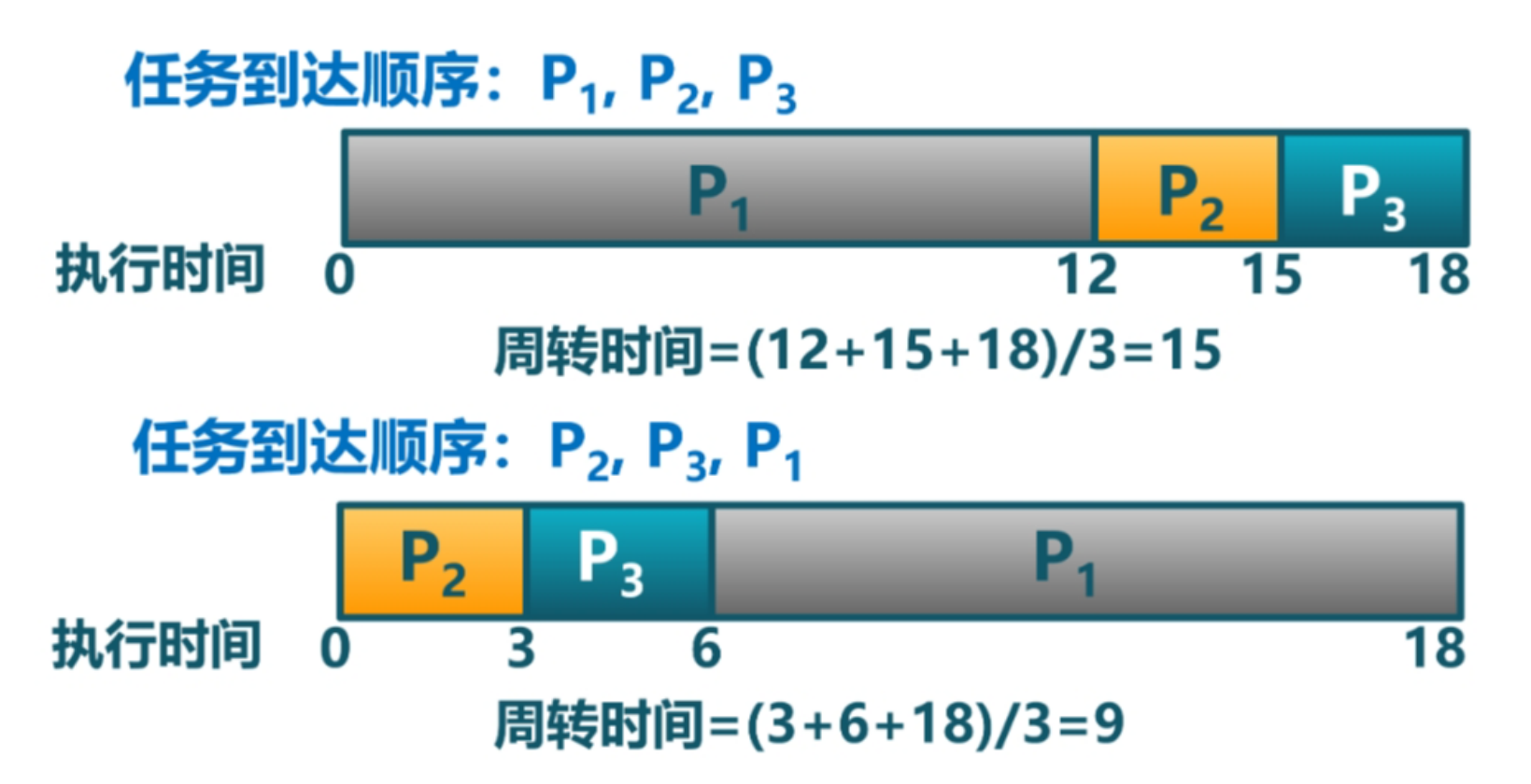 可以看到,如果采用先来先服务调度策略,执行时间短的进程(简称短进程)可被排在执行时间长的进程(长进程)后面,导致进程的平均周转时间变长。