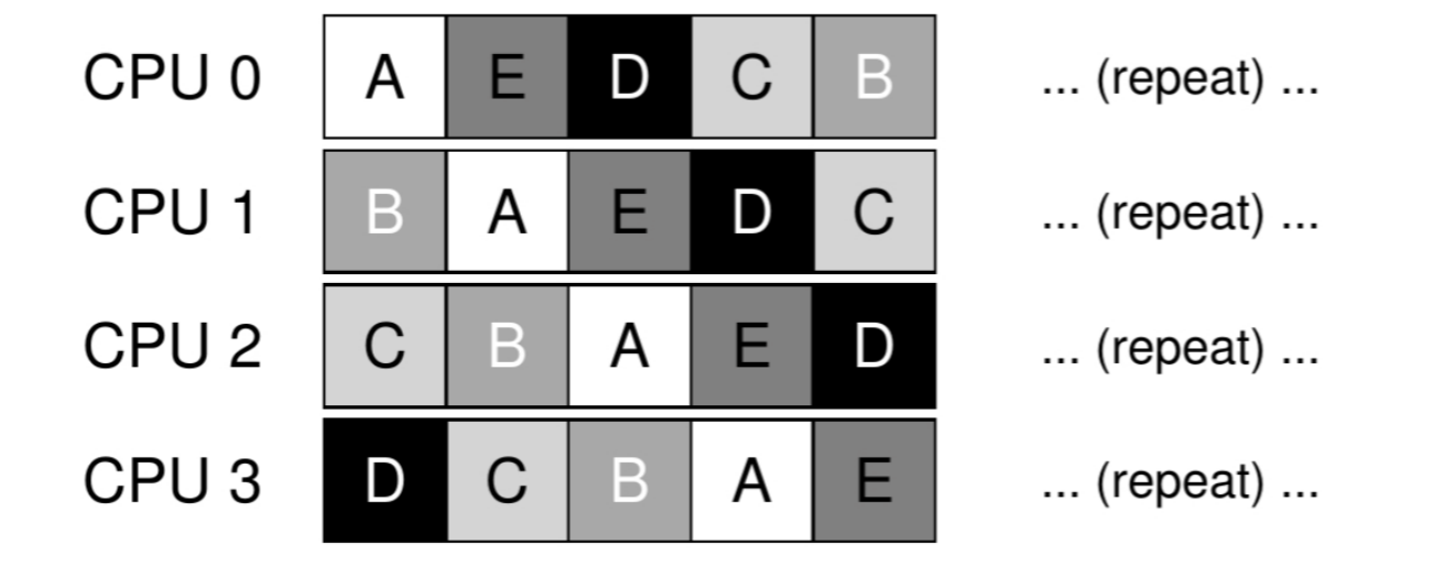 对于多处理器系统而言,两个进程数量多于处理器个数,我们希望每个处理器都执行进程。这一点是之前单处理器调度不会碰到的情况。单处理器的调度只需不断地解答:“接下来应该运行哪个进程?”,而在多处理机中,调度还需解答一个问题:“要运行的进程在哪一个CPU上运行?”。这就增加了调度的复杂性。