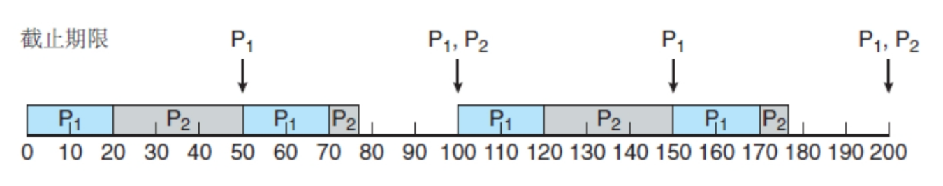上述例子的一个有趣的现象是,虽然RMS调度算法与EDF的调度策略不同,但它们的调度过程是一样的。注意,这不是普遍现象,也有一些例子会出现二者调度过程不同的情况,甚至RMS调度无法满足进程的时限要求,而EDF能满足进程的时限要求。同学们能举出这样的例子吗?