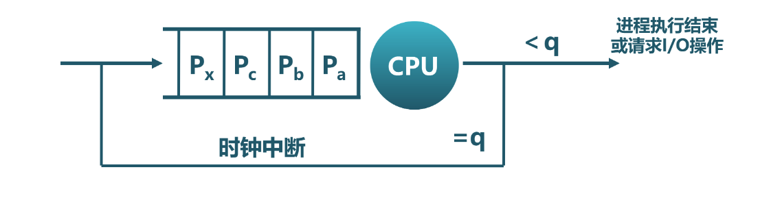 • 当正在运行的进程执行完毕时,操作系统会回收该进程所在资源,并从就绪队列头取出一个进程执行;