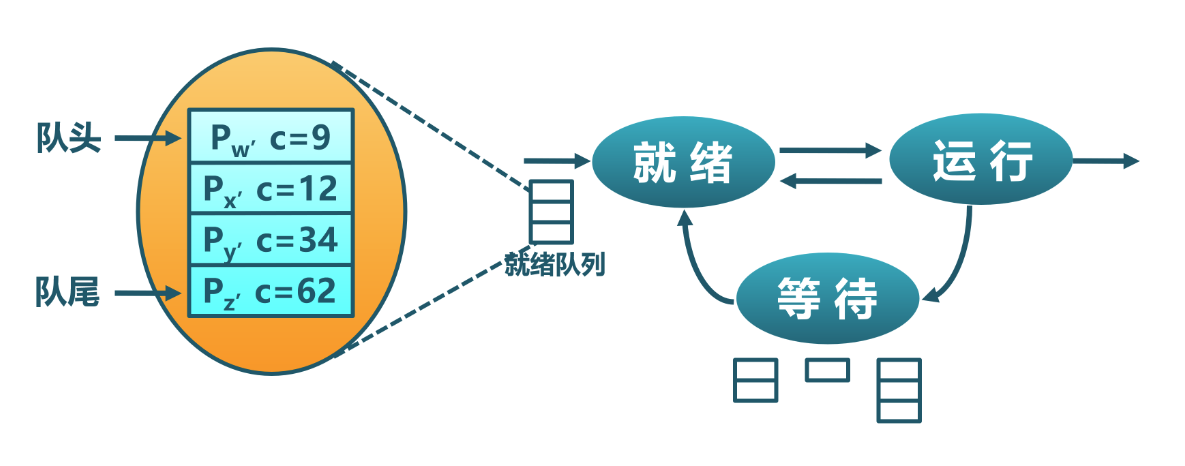 • 当正在运行的进程需要等待某个事件或资源时,操作系统会把该进程从就绪队列中移出,放到等待队列中(此时这个进程从就绪进程变成等待进程),并从就绪队列头取出下一个进程执行;