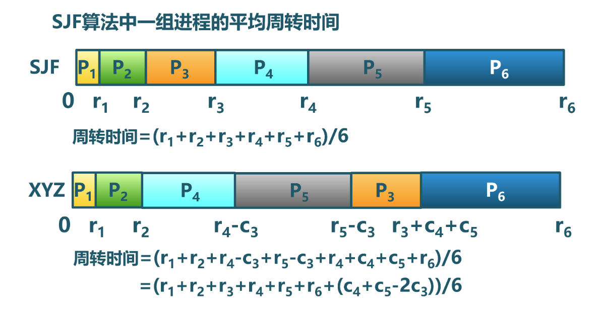 由于前提条件1 明确指出所有进程在同一时间到达,那么 \(T_{到达时间} = 0\) ,因此 \(T_{周转时间} = T_{完成时间}\) 。除了总的周转时间,我们还需要关注平均周转时间这样的统计值: