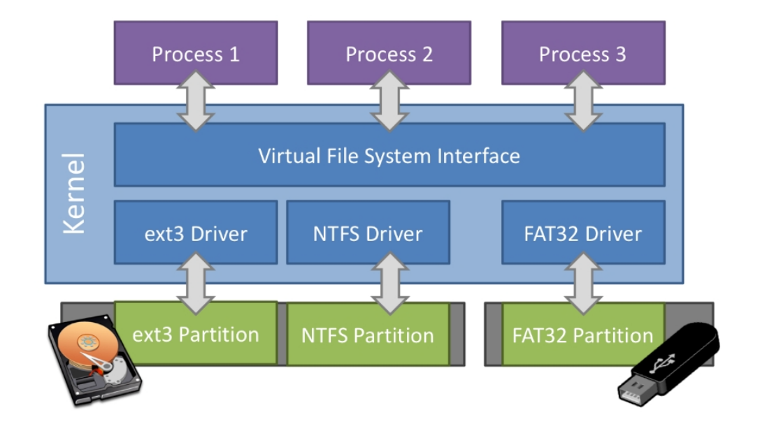 在一个计算机系统中,可以同时包含多个持久存储设备,它们上面的数据可能是以不同文件系统格式存储的。为了能够对它们进行统一管理,在内核中有一层 虚拟文件系统 (VFS, Virtual File System) ,它规定了逻辑上目录树结构的通用格式及相关操作的抽象接口,只要不同的底层文件系统均实现虚拟文件系统要求的那些抽象接口,再加上 挂载 (Mount) 等方式,这些持久存储设备上的不同文件系统便可以用一个统一的逻辑目录树结构一并进行管理。