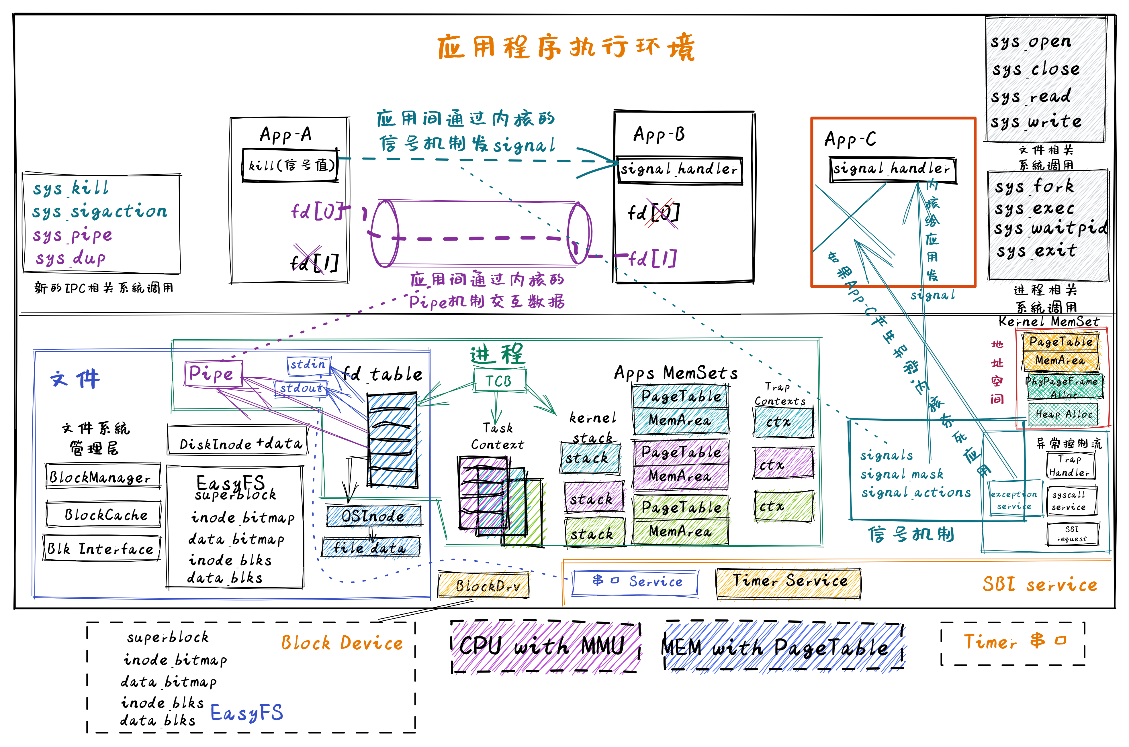 这里把管道看成是一种特殊的内存文件,并在进程的打开文件表 fd_talbe 中被管理,而且进程通过文件读写系统调用就可以很方便地基于管道实现进程间的数据交换。而信号是进程管理的一种资源,发送信号的进程可以通过系统调用给接收信号的目标进程控制块中的 signal 结构更新所发信号信息,操作系统再通过扩展 trap_handler 中从内核态返回到用户态的处理流程, 改变了接收信号的目标进程的执行上下文,从而让接收信号的目标进程可以优先执行处理信号事件的预设函数 signal_handler ,在处理完信号后,再继续执行之前暂停的工作。