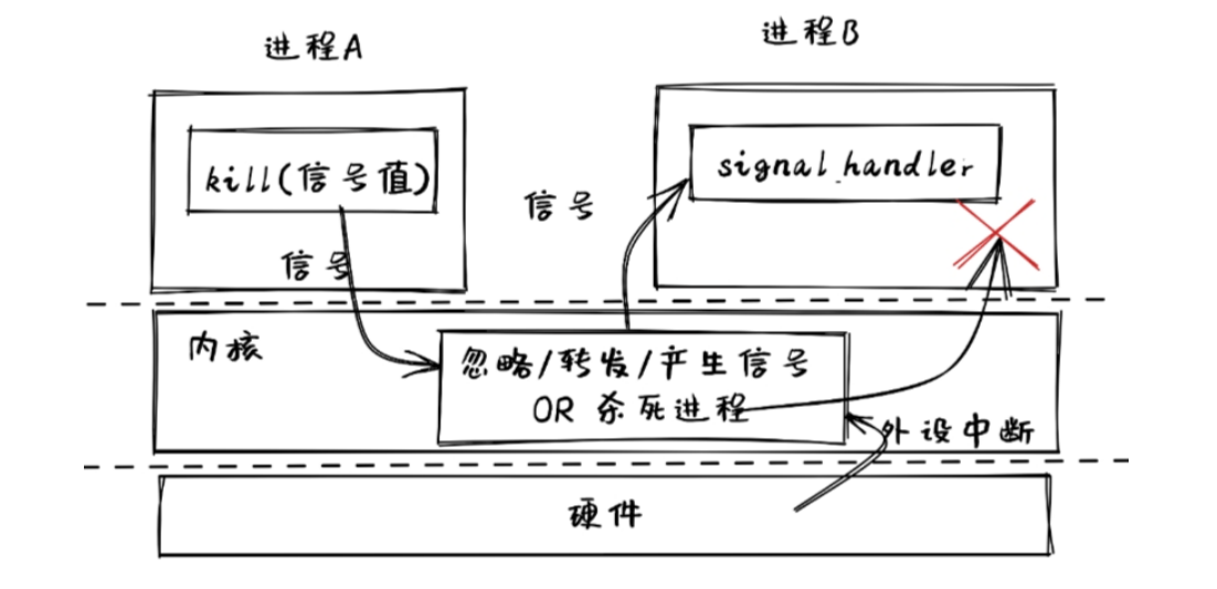 在进程间还存在“事件通知”的需求:操作系统或某进程希望能单方面通知另外一个正在忙其它事情的进程产生了某个事件,并让这个进程能迅速响应。如果采用之前同步的 IPC 机制,难以高效地应对这样的需求。比如,用户想中断当前正在运行的一个程序,于是他敲击 Ctrl-C 的组合键,正在运行的程序会迅速退出它正在做的任何事情,截止程序的执行。
