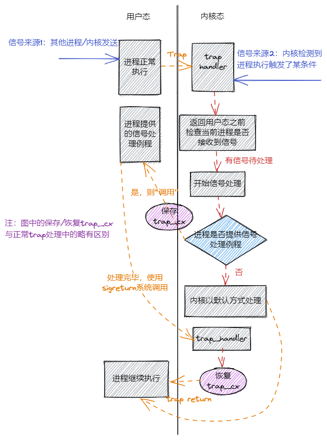 内核会在 Trap 处理完成即将返回用户态之前检查要返回到的进程是否还有信号待处理。如果需要处理的话,取决于进程是否提供该种信号的处理函数,有两种处理方法: